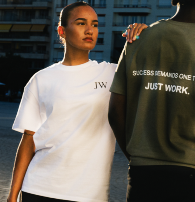 Tee-shirt oversize écoresponsable, confectionné en coton biologique premium. Flocage JW côté cœur, design "Success demands one thing: Just Work" au dos.